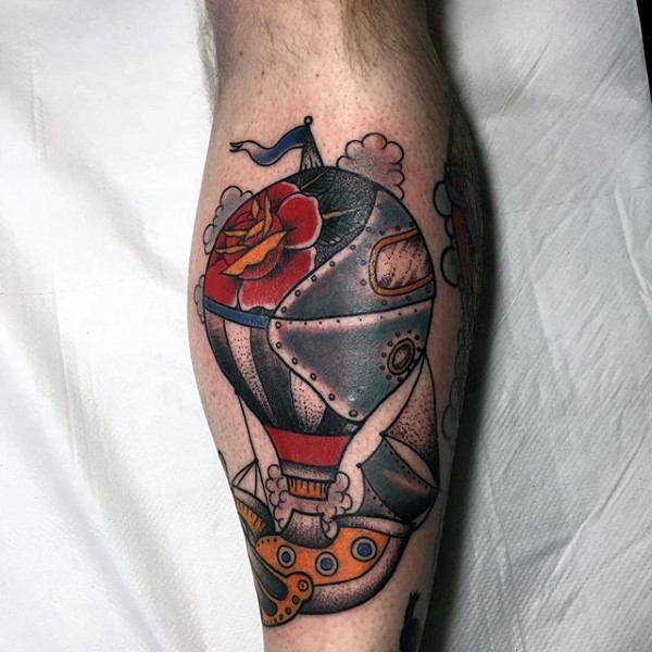 老式风格的彩色机械飞行气球纹身图片