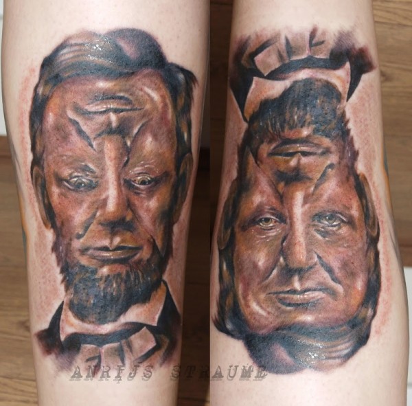 腿部彩色超现实主义风格肖像纹身图案