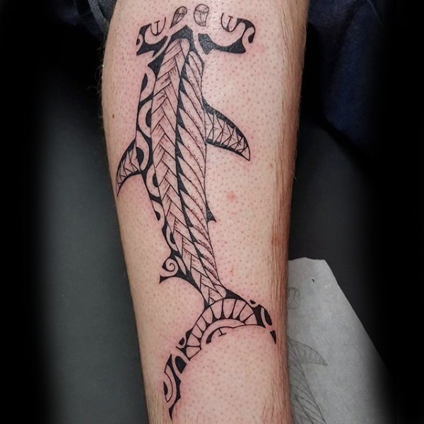 腿部黑色波利尼西亚风格的锤头鲨纹身