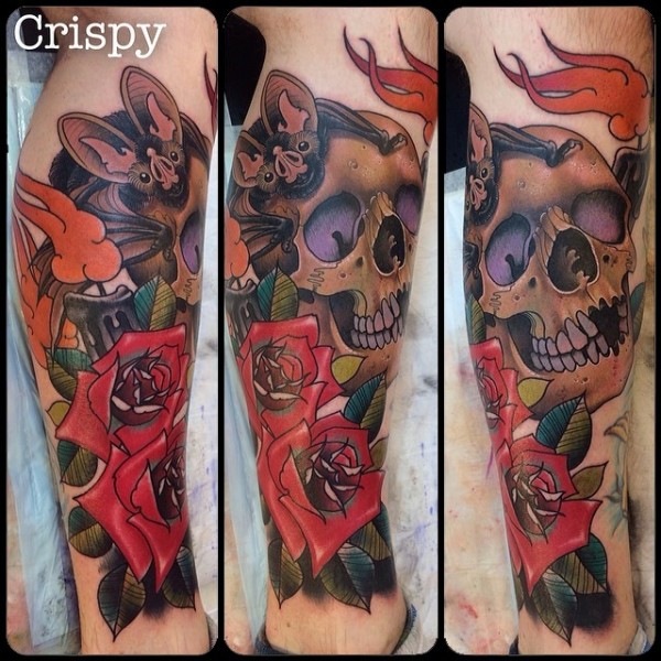 腿部新学校风格人类头骨与玫瑰花纹身