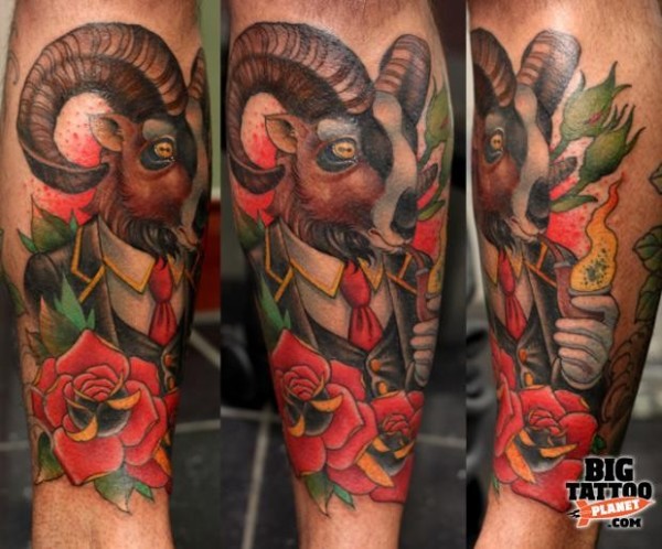 腿部彩色烟熏山羊与玫瑰纹身图案