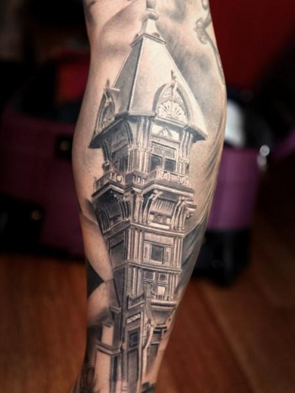 腿部灰色逼真的老式房屋纹身图片