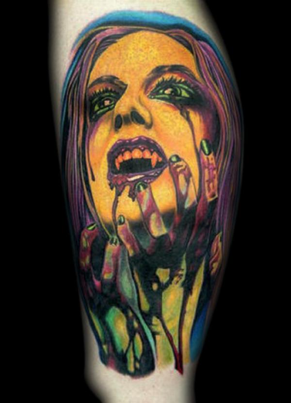 腿部老漫画风格彩色血腥吸血鬼肖像纹身