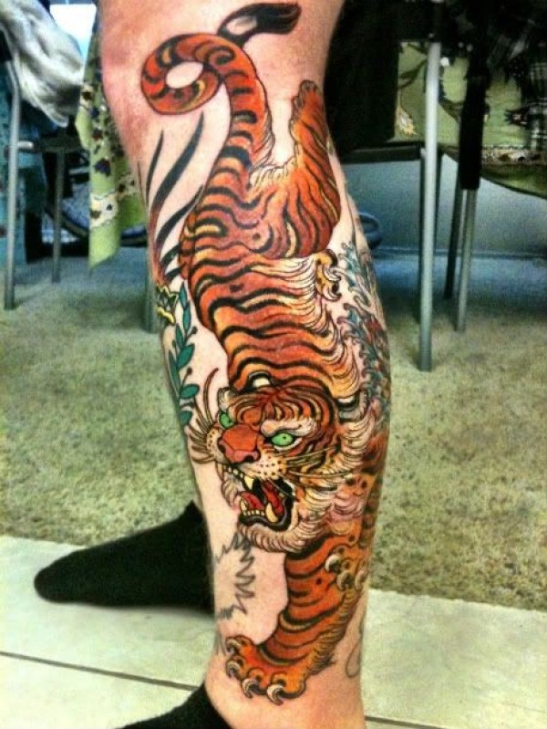 腿部华丽的彩色大恶魔老虎纹身图片