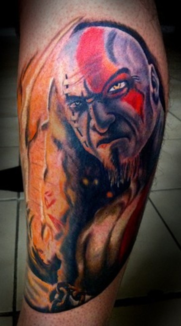 腿部彩色野蛮人肖像纹身图案
