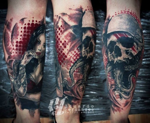 腿部彩色士兵士兵骷髅与女子肖像纹身