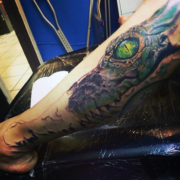 腿部彩色逼真的大鳄鱼纹身图案