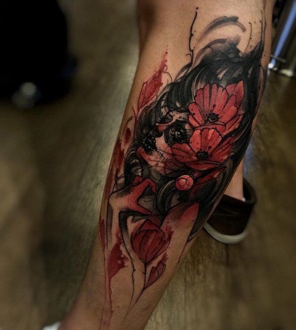 腿部墨西哥土著传统彩色女子肖像纹身