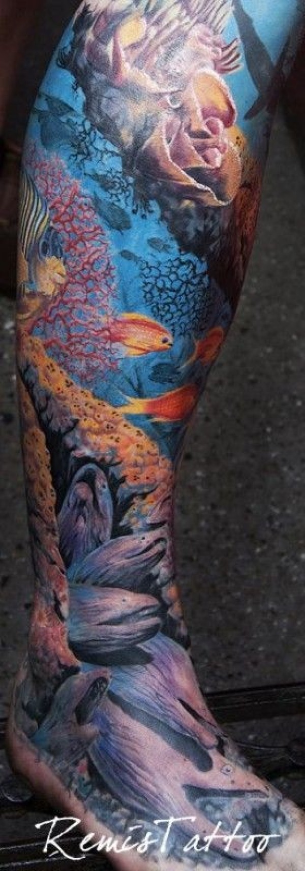 腿部彩色海底世界纹身图案