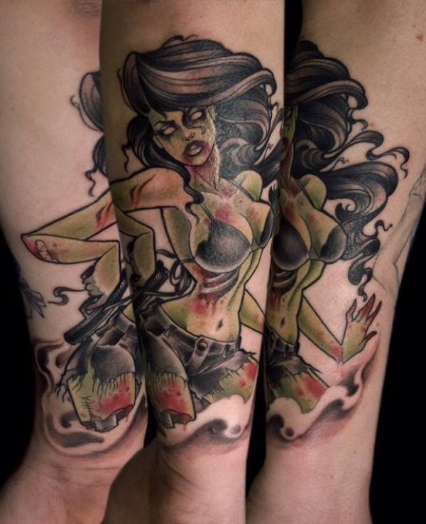 腿部彩色性感女性僵尸纹身图案