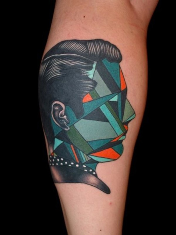 腿部彩色几何露脸肖像纹身图片