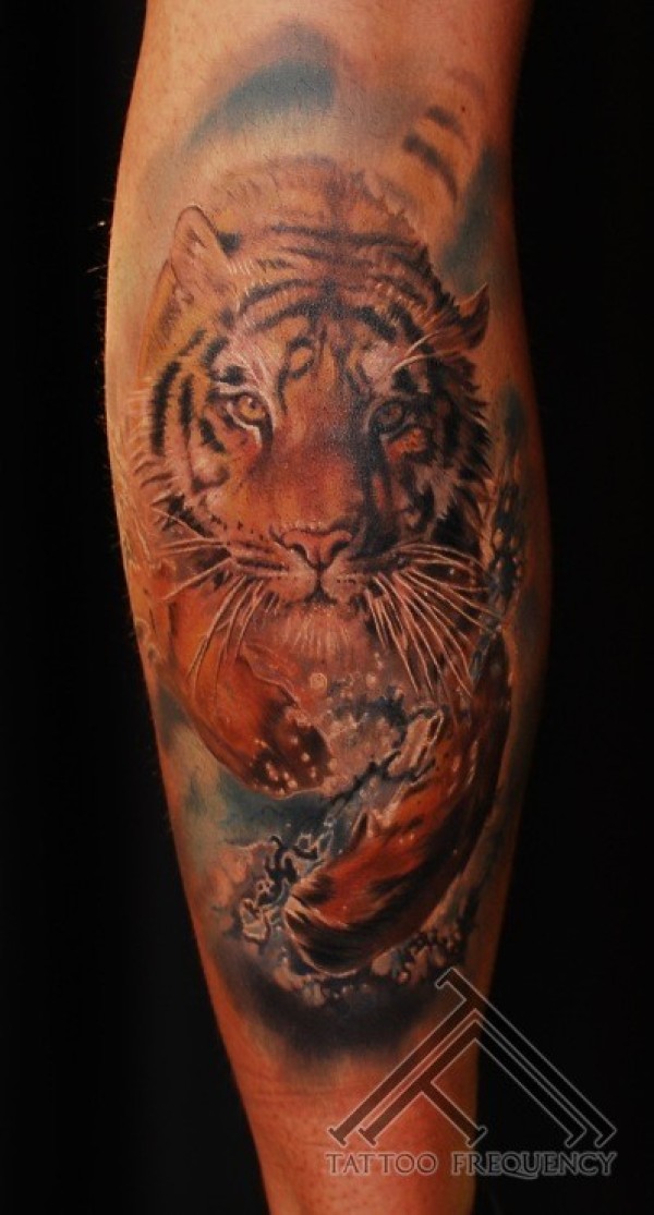 腿部彩色逼真的老虎纹身图案