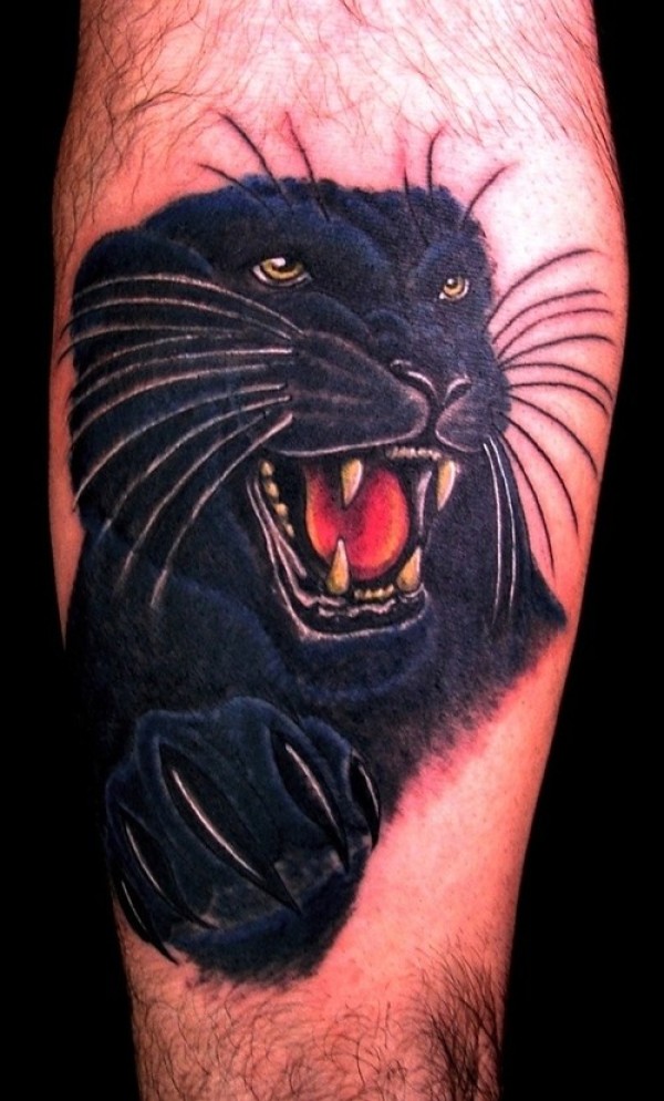 腿部彩色黑豹肖像纹身图案