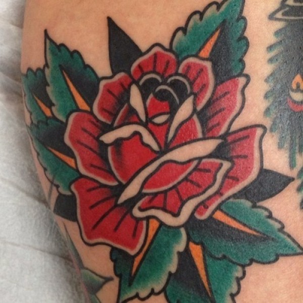 腿部老式手绘简易小玫瑰纹身图片