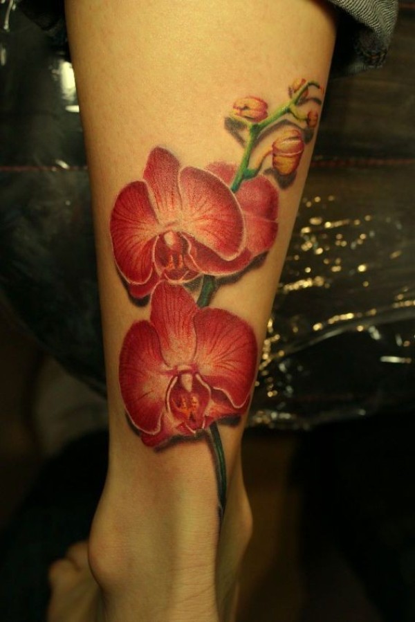 腿部彩色逼真的红色兰纹身图片