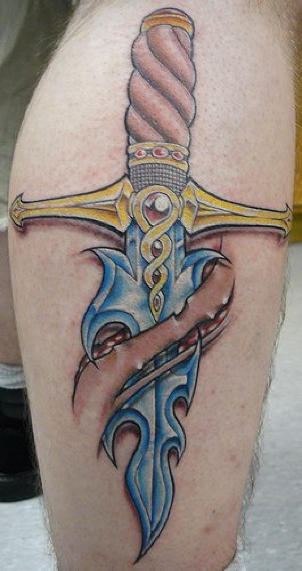 腿部彩色锋利的剑纹身图案