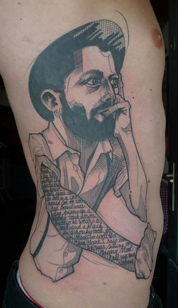腰侧素描风格男子纹身图案