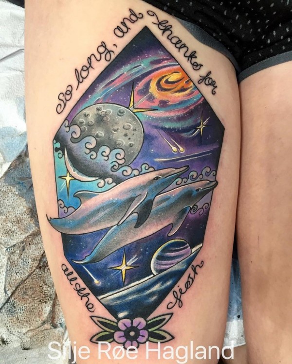 腿部新传统风格的彩色海豚游泳纹身