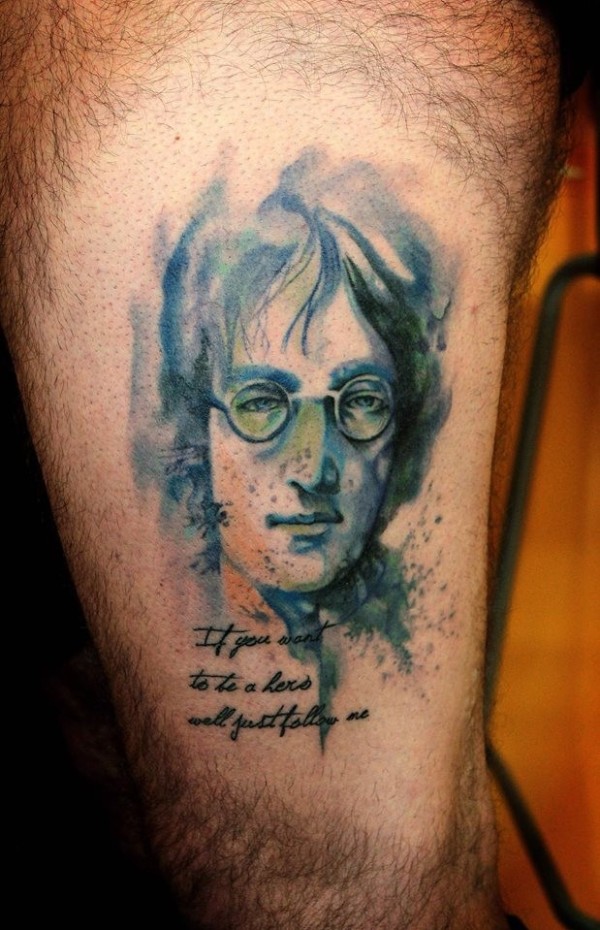 腿部插画风格色彩的人物肖像纹身图案