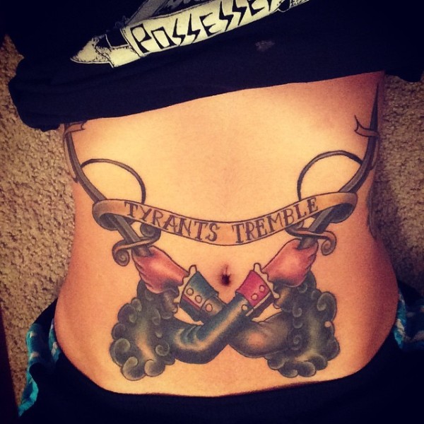 腹部老学校的风格交叉双手剑纹身