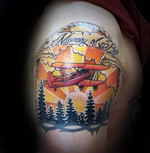 肩部彩色插画风格的森林和飞机纹身