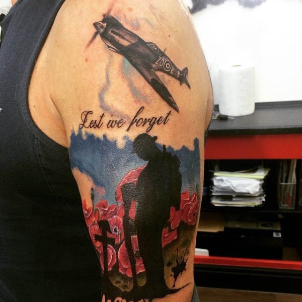 肩部彩色纪念式性军事纹身图案