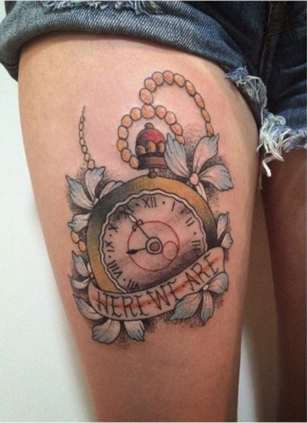 腿部彩色老古董钟敲字母纹身图案