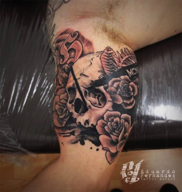 肩部复古风格的花和人类头骨纹身