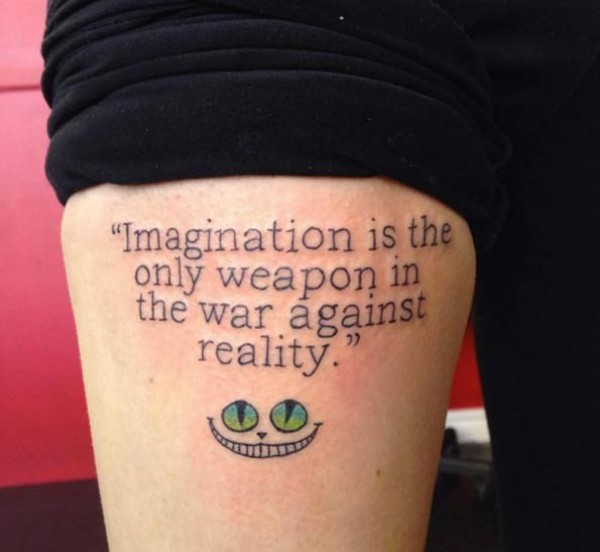 腿部彩色英文字母与柴郡猫的微笑纹身