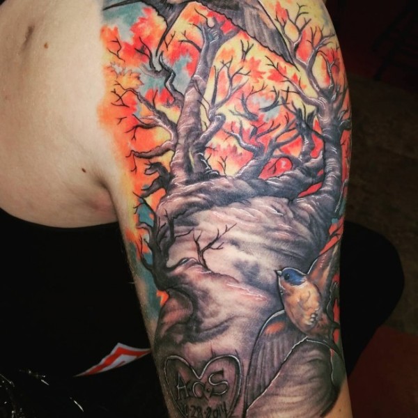 肩部奇妙的彩色孤独树和鸟儿纹身图片