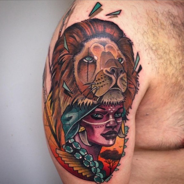 新学校风格的彩色肩部部落妇女与狮子纹身