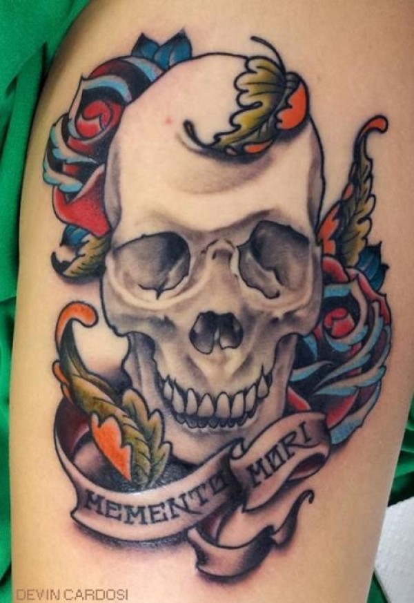 简单的风格腿部彩色骷髅大花纹身