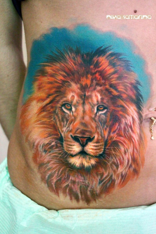 男性腰部彩色狮子头纹身图案