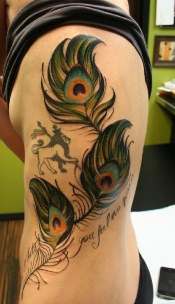 腰侧彩色孔雀羽毛与狮子纹身图片