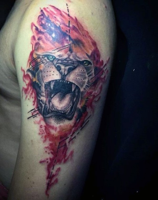 现代风格的彩色肩膀狮子与火焰纹身