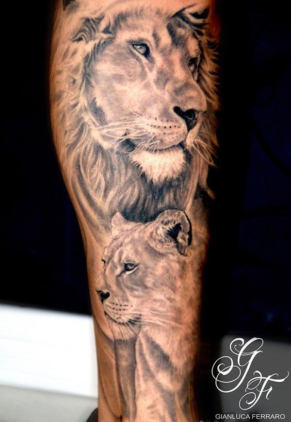 腿部棕色费雷罗狮和母狮纹身图片
