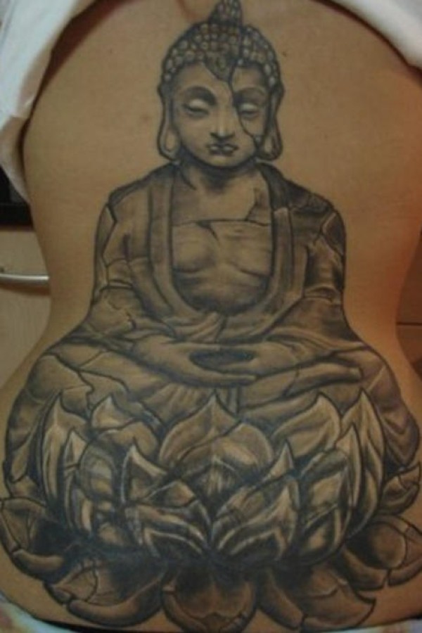腰部黑灰大石头佛像莲花纹身