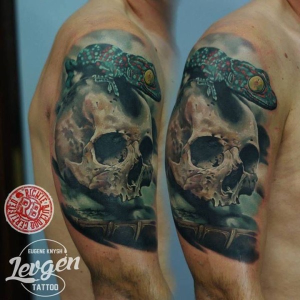 现实主义风格的彩色人类头骨和蜥蜴纹身