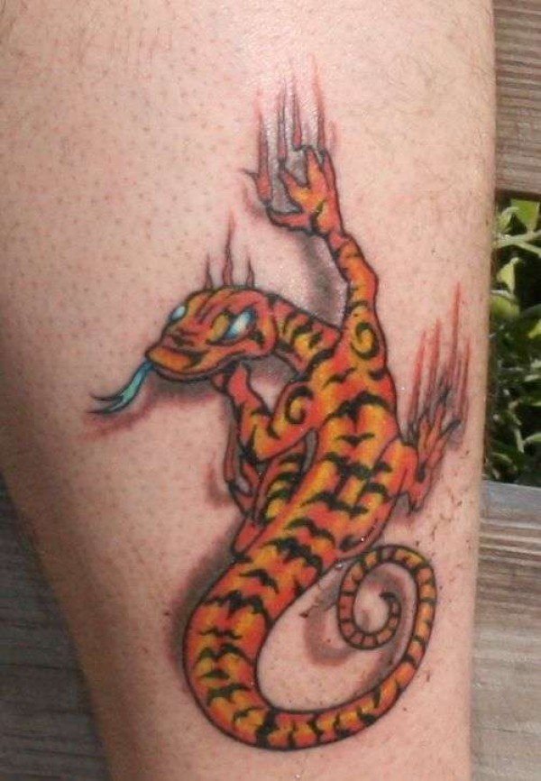 腿部彩色虎蜥撕皮纹身图案