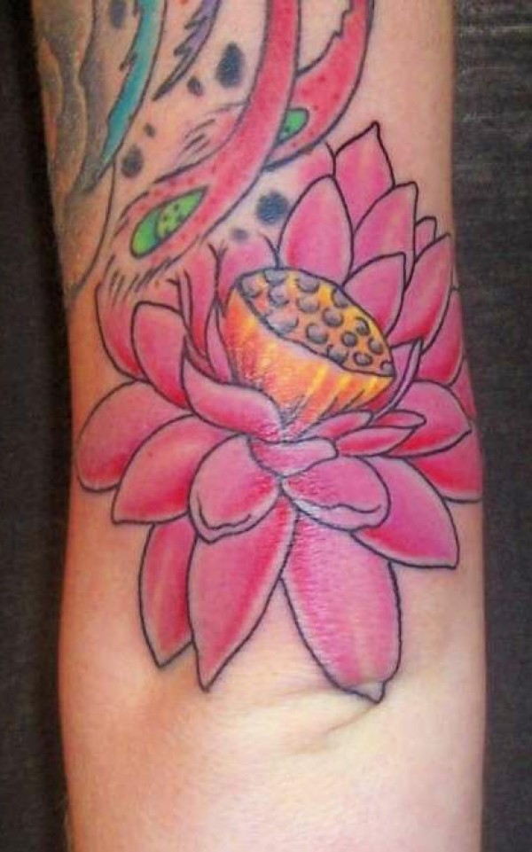 女性手臂彩色粉红莲花纹身图案