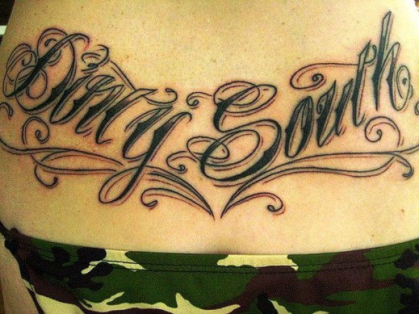 腰部黑色英文字母纹身图案