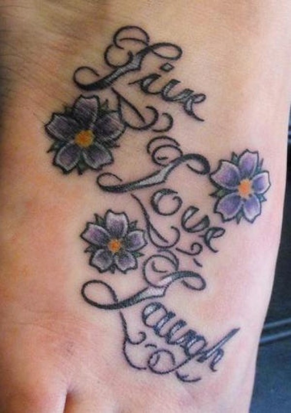 脚部彩色花朵英文纹身图案