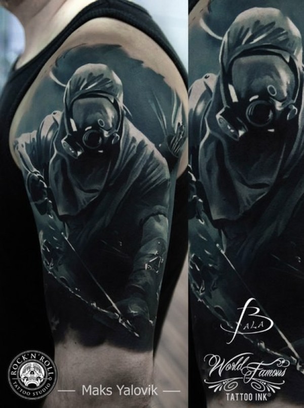 肩部插画风格的男人与防毒面具纹身
