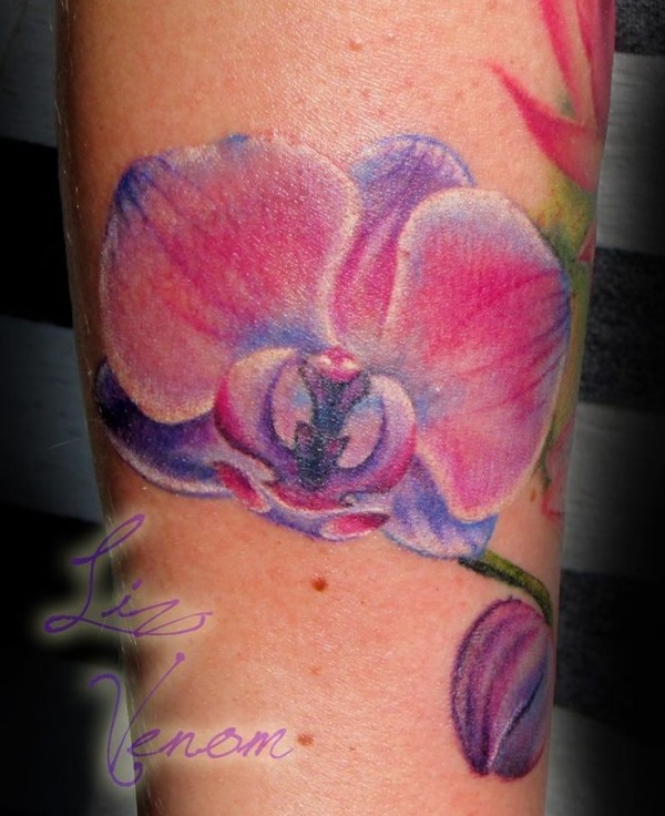 手臂彩色可爱的紫色兰花纹身图片