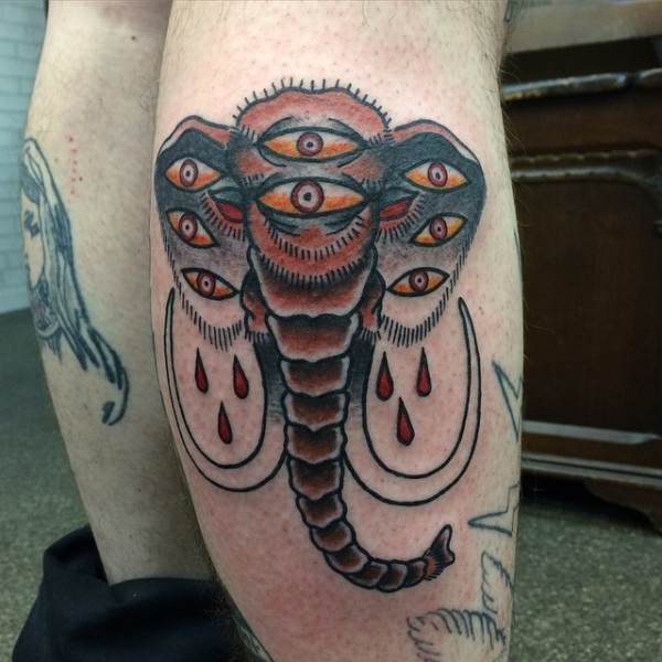 腿部彩色旧学校多眼睛猛犸纹身图片