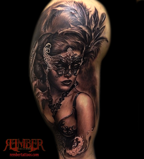 肩部现实主义风格的彩色妇女面具纹身