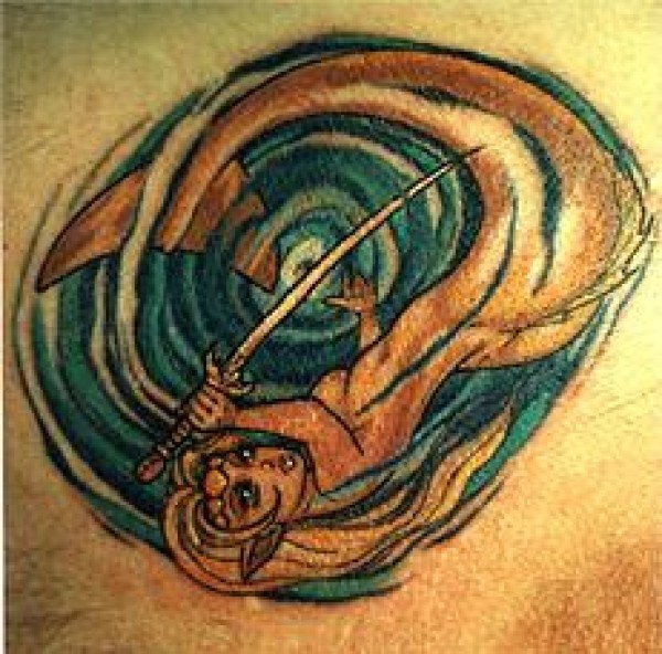 背部彩色美人鱼和漩涡纹身图片