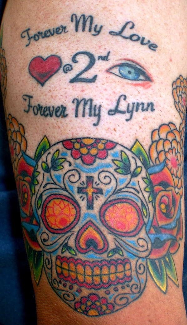 肩部彩色糖骷髅英文纹身图案