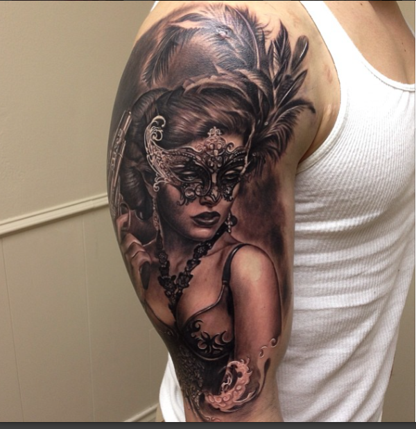 肩部逼真的彩色诱惑女人面具纹身