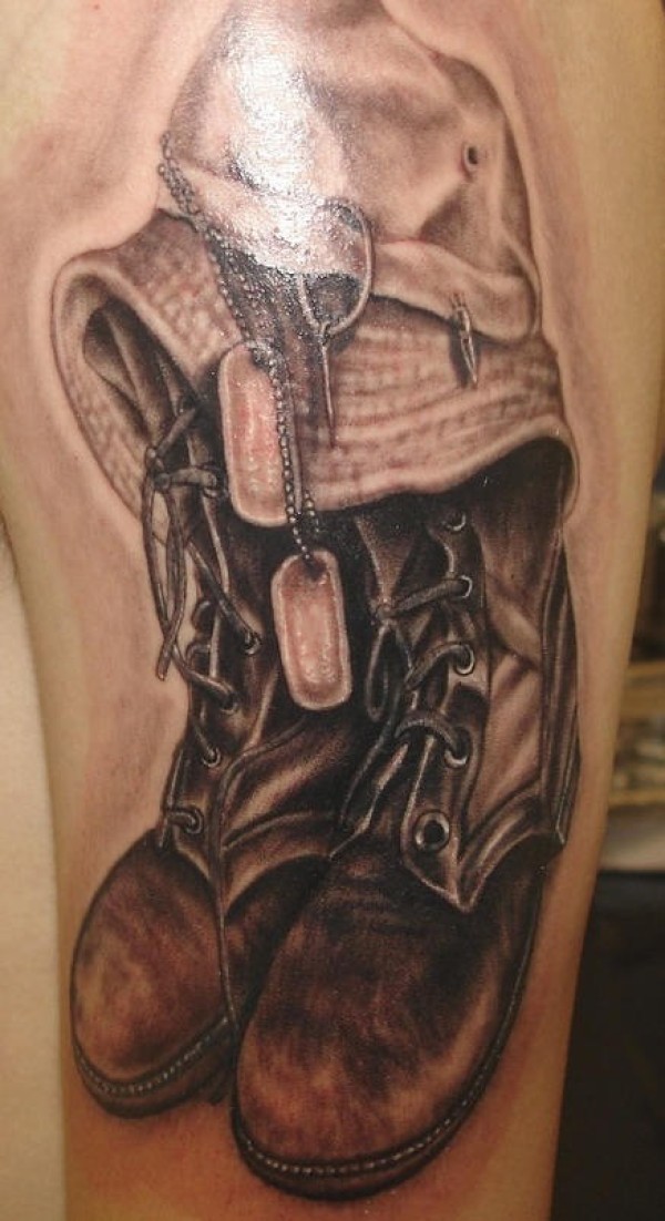 手臂棕色军事鞋子纹身图案